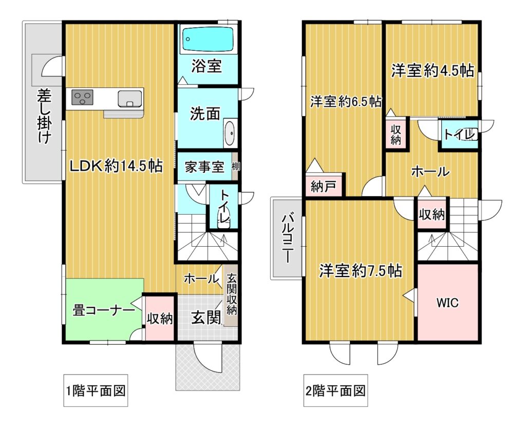 間取内容 【1階】LDK約14.5、畳コーナー 【2階】洋約7.5、洋約6.5、洋約4.5
