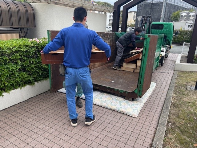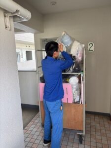 前回までに分別していた廃棄物の搬出からスタートし、マンションでも安全第一に進めていきます。