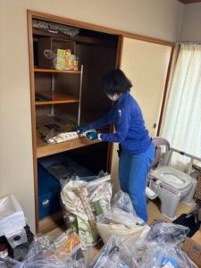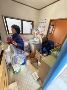 1日目は、洗面所・押し入れ・各お部屋にある日用品や衣類、小物類などの 分別作業 を中心に進めています。